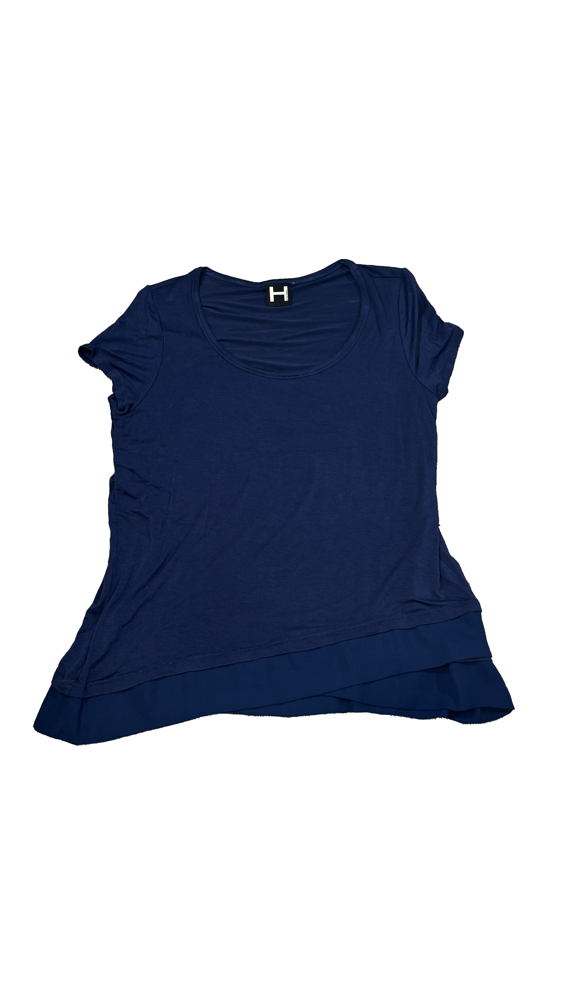 Modern minimalist top from H by Bordeaux, known for its elevated basics sold at Nordstrom. This navy short-sleeve tee features a layered chiffon hemline for a subtle, draped silhouette that transitions effortlessly from casual to refined.